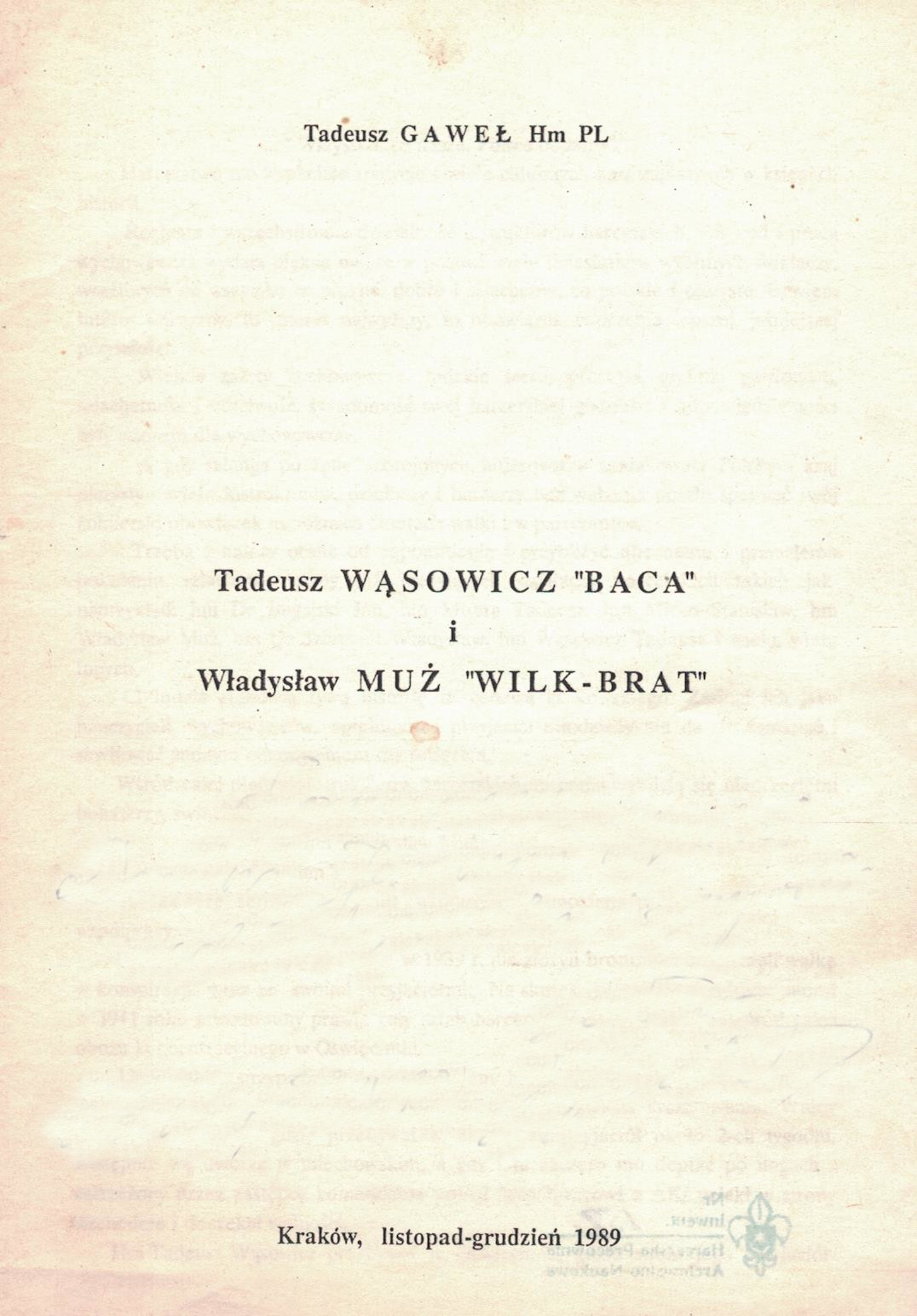 "W 1990 roku upływa 80 lat od powstania skautingu a następnie harcerstwa na terenie polski. Minęło również 37 lat od śmierci przedwcześnie zmarłego hm Tadeusza Wąsowicza "Bacy" i 30 lat od odejścia na wieczną wartę Władysława Muża "Brata-Wilka" [ze wstępu].
