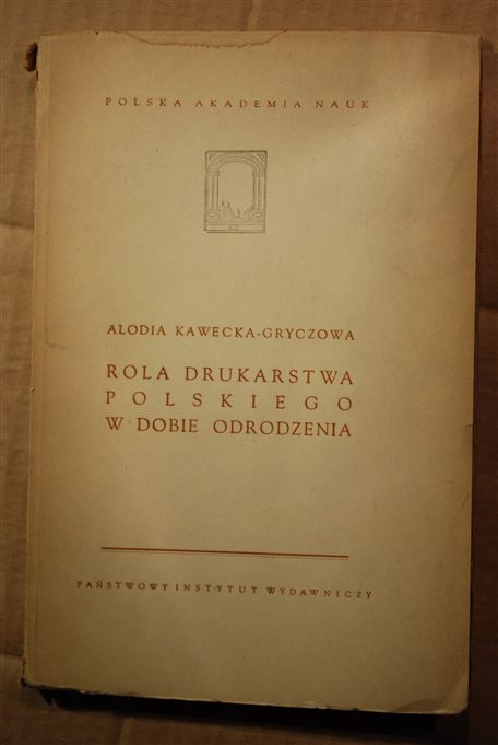 Rola drukarstwa polskiego w dobie Odrodzenia / Alodia Kawecka-Gryczowa ; Polska Akademia Nauk. - Warszawa : PIW, 1954. - 120, [2] strony, [12] kart tablic : ilustracje ; 20 cm.