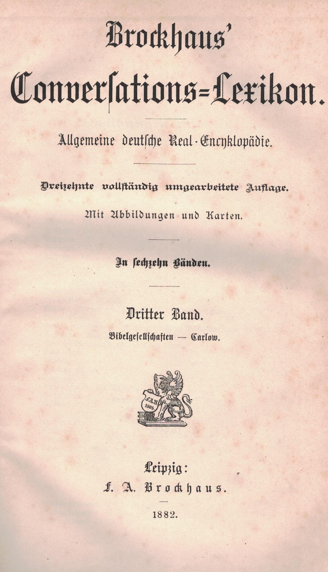 Brockhaus' Conversations - Lexikon : allgemeine deutsche Real-Encyklopädie. B. 3, Bibelgesellschaften - Carlow. - 13, vollständig umgearbeitete Auflage. - Leipzig : F.A.Brockhaus, 1882. - [6], 954 strony, [54] kart tablic (niektóre złożone) : ilustracje ; 26 cm.