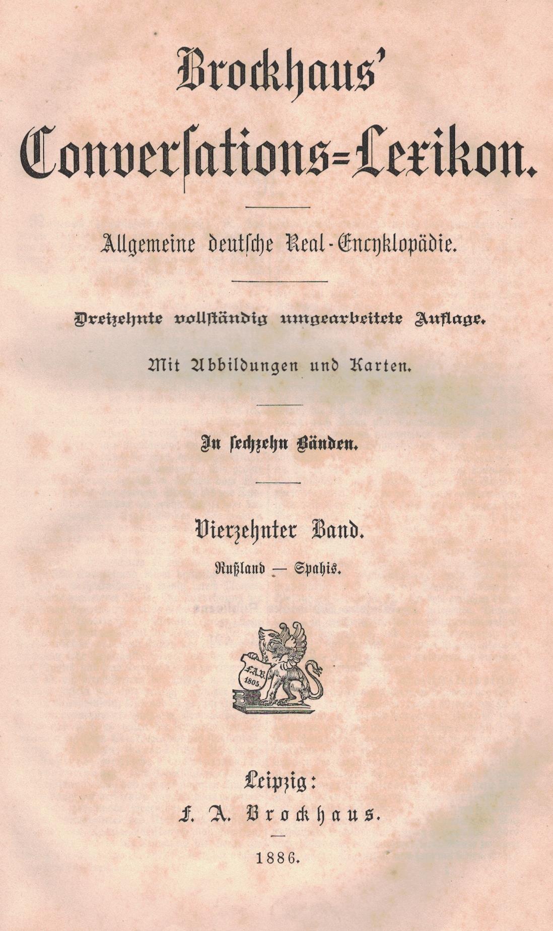 Brockhaus' Conversations - Lexikon : allgemeine deutsche Real-Encyklopädie. B. 14, Roßland - Spahis. - 13, vollständig umgearbeitete Auflage. - Leipzig : F.A. Brockhaus, 1886. - [4], 954, [2] strony, [41] kart tablic (niektóre złożone) ; 26 cm.