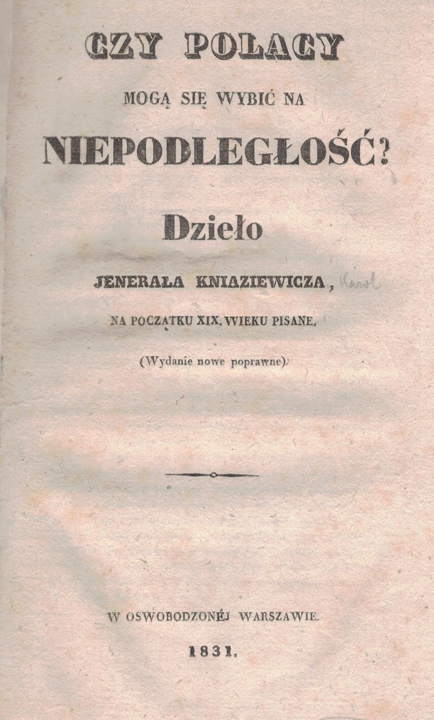 Na stronie tytułowej w miejscu adresu wydawcy: W oswobodzonéj Warszawie 1831.