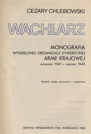 Wachlarz : monografia wydzielonej organizacji dywersyjnej Armii Krajowej wrzesień 1941 - marzec 1943 / Cezary Chlebowski. - Warszawa : "Pax", 1983. - 353, [3] strony, [72] strony tablic [5] k. luź. : fotografie, mapy, portret ; 25 cm.