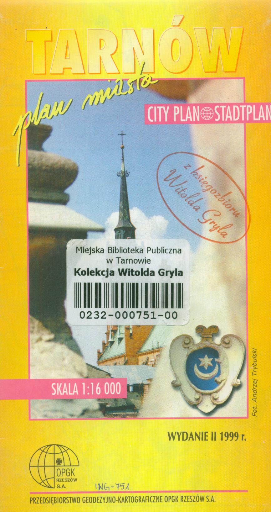 Tarnów : plan miasta : mapa / oprac. OPGK ; fot. Andrzej Trybulski. - Wydanie 2. - Rzeszów : OPGK, 1999. - 1 mapa : kolor. ; 82 x 57, złoż. 21 x 11 cm.
