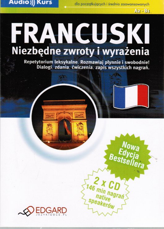 Francuski : niezbędne zwroty i wyrażenia / [Jakub Bero, Radosław Kucharczyk]. - Warszawa : Wydawnictwo Edgard, 2009. - 2 płyty audio (CD) (146 min) : zapis cyfrowy, stereo ; 12 cm + 1 książka : 136 stron ; 19 cm.