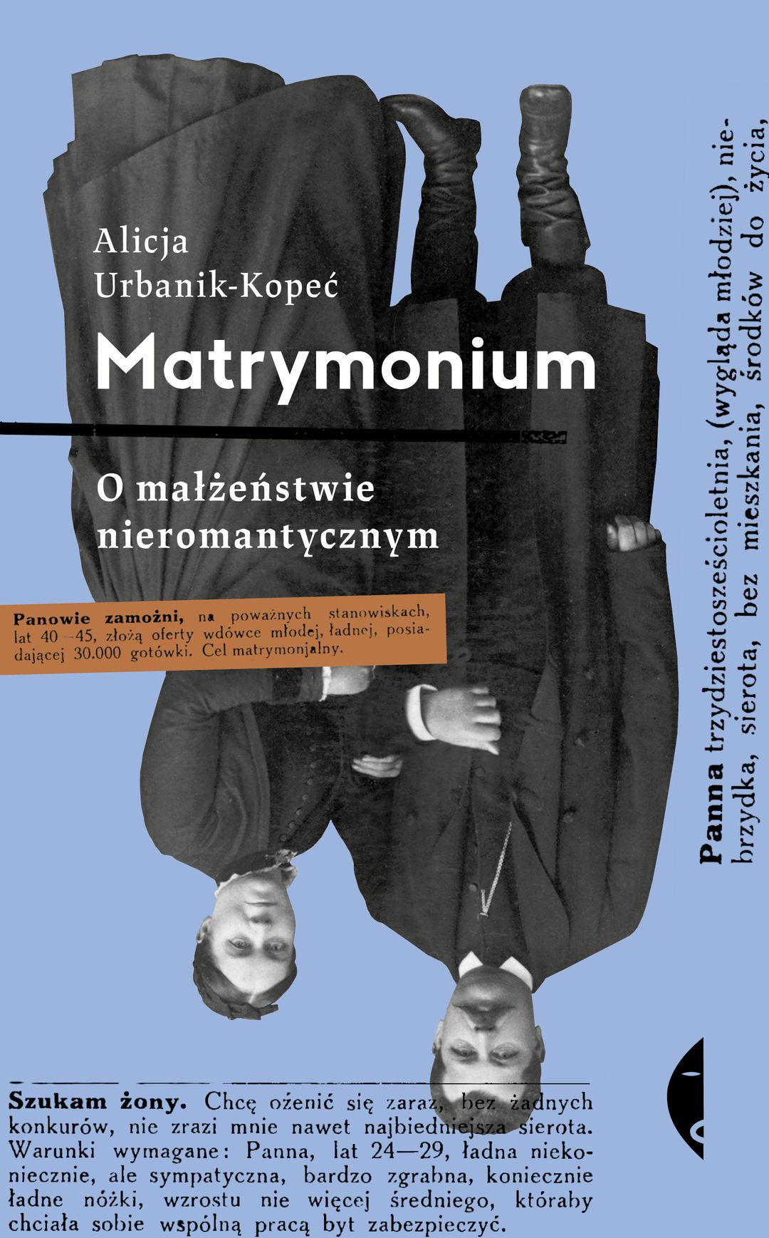 Alicja Urbanik-Kopeć przygląda się dziewiętnastowiecznemu rynkowi matrymonialnemu, na którym liczyły się posag, weksle i cenne pamiątki rodzinne, nierzadko pomagające narzeczonemu w spłacie długów. Szczególnie uważnie analizuje sytuację kobiet – młodych robotnic, mężatek, starych panien oraz wdów, których samodzielność finansowa stopniowo wzrastała, lecz ciężar społecznych oczekiwań pozostawał ten sam. Matrymonium to barwny opis kolejnych etapów związku: od poszukiwań partnera za pomocą anonsów aż po małżeństwo, które zapewniało kobiecie bezpieczeństwo finansowe oraz złudzenie życiowego sukcesu. Czy jednak biznes małżeński naprawdę był najlepszym z rozwiązań? Korzystając z oryginalnych świadectw epoki – artykułów prasowych, pamiętników, powieści i poradników – autorka przybliża system prawno-społeczny panujący na aż do dwudziestolecia międzywojennego. Zza ciasnych ram tego systemu wyłania się pasjonujący obraz kobiet, które próbowały kształtować własne życie: miłosne, rodzinne i finansowe.