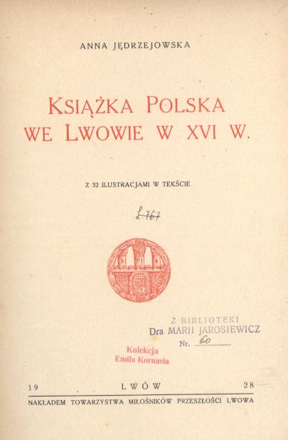 Książka polska we Lwowie w XVI w. : z 32. il. w tekście / Anna Jędrzejowska. - Lwów : Towarzystwo Miłośników Przeszłości Lwowa, 1928 (Lwów : Książnica-Atlas). - VIII, 98, [1] strona, [2] karty tablic : ilustracje ; 24 cm.