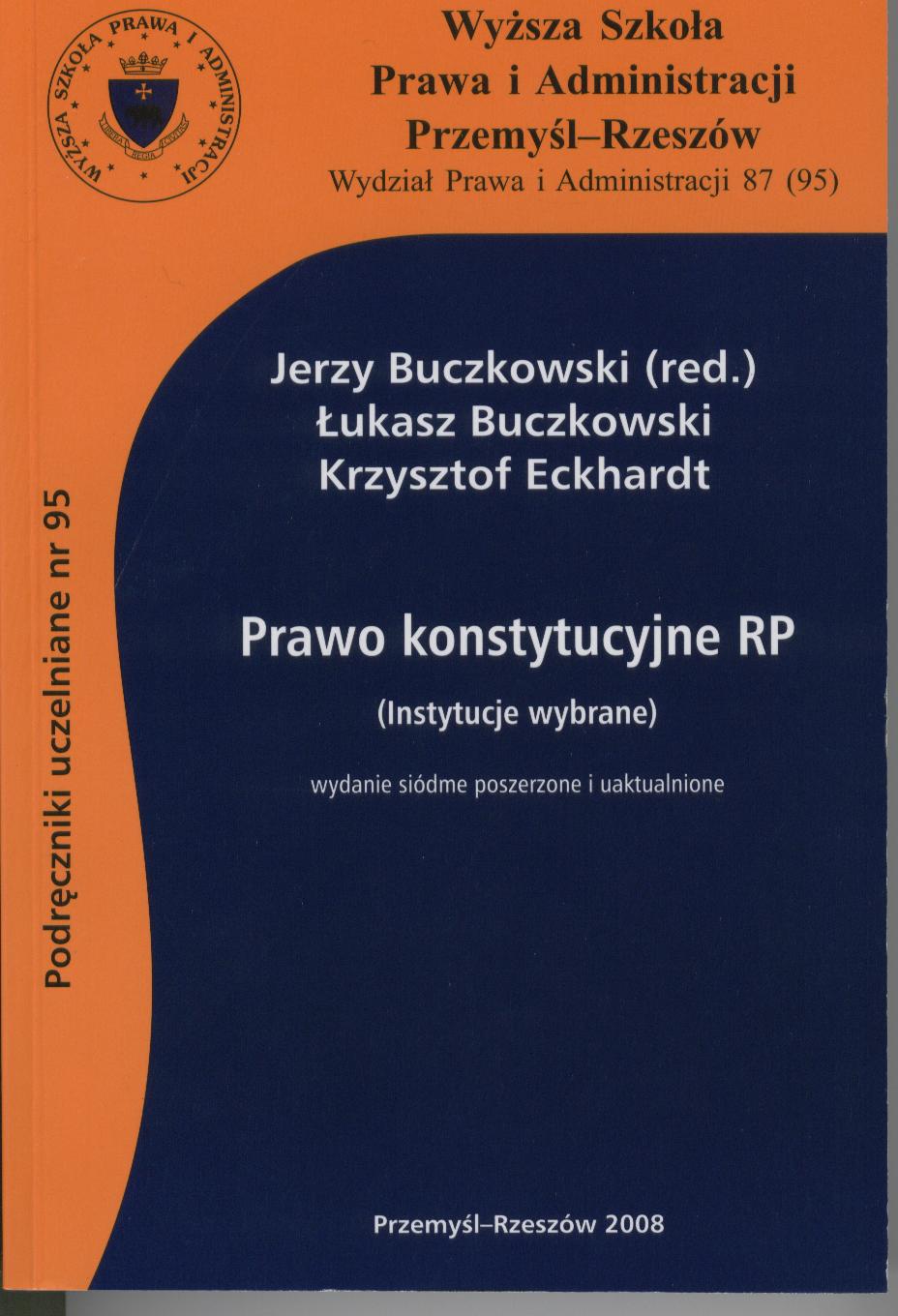 Prawo konstytucyjne RP : (instytucje wybrane) / Jerzy Buczkowski (red.), Łukasz Buczkowski, Krzysztof Eckhardt. - Wydanie 7 poszerzone i uaktualnione, stan prawny na dzień 30 czerwiec 2008 r. - Przemyśl : Wyższa Szkoła Administracji i Zarządzania, 2008. - 453 strony ; 24 cm.