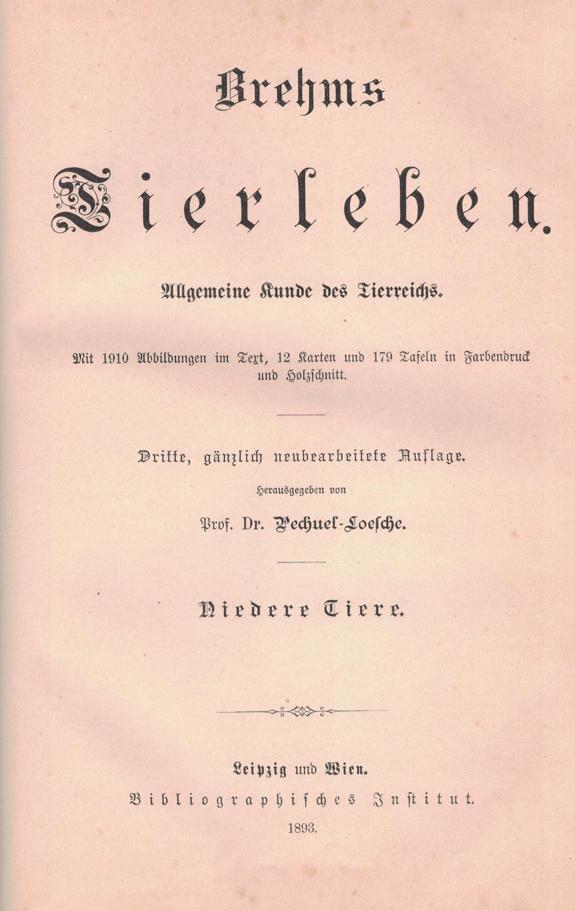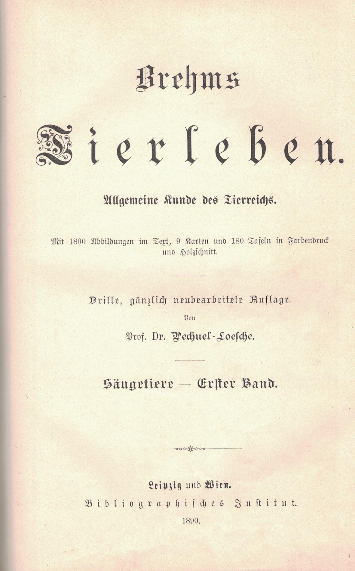Brehms Tierleben : allgemeine Kunde des Tierreichs. Bd. 1, Die Säugetiere. - 3, gänzlich neubearbeitete Auflage / von Pechuel-Loesche. - Leipzig ; Wien : Bibliographischen Institut, 1890. - XLIV, 702 strony, [19] kart tablic : ilustracje ; 26 cm.