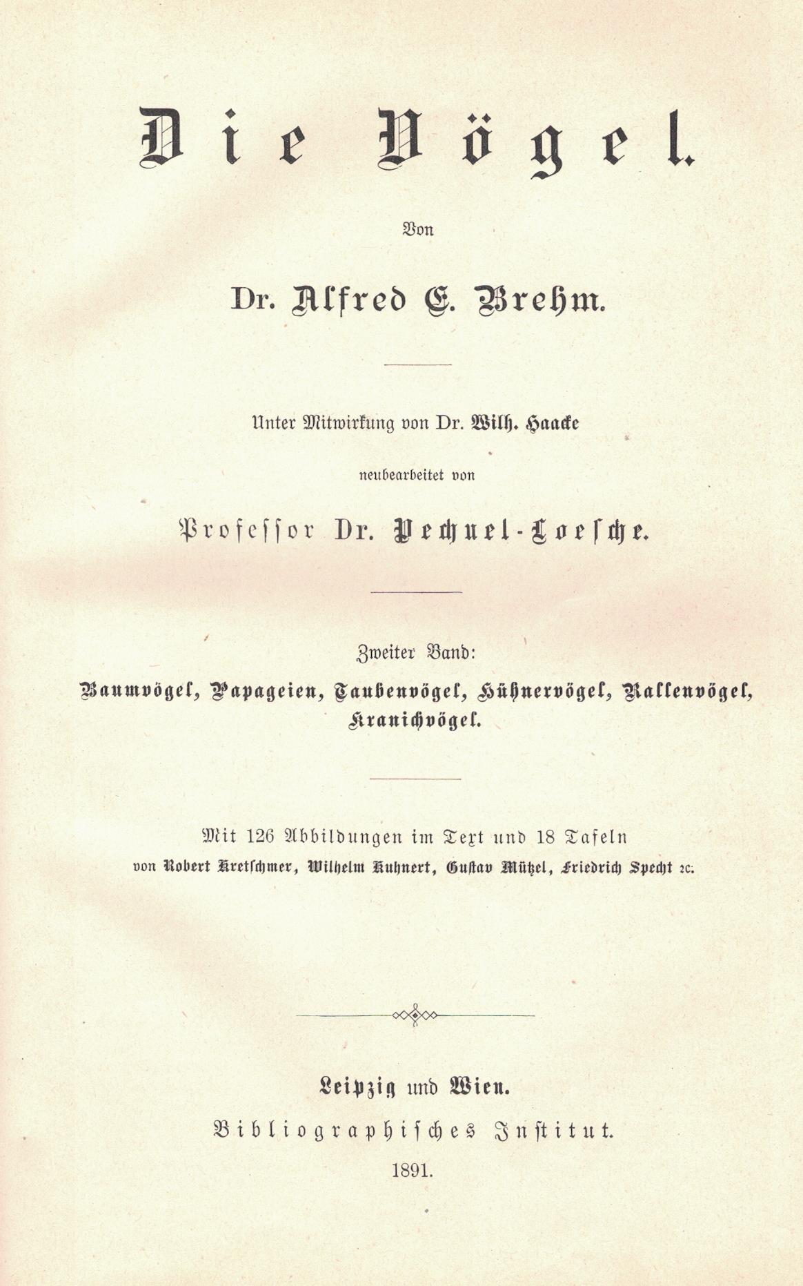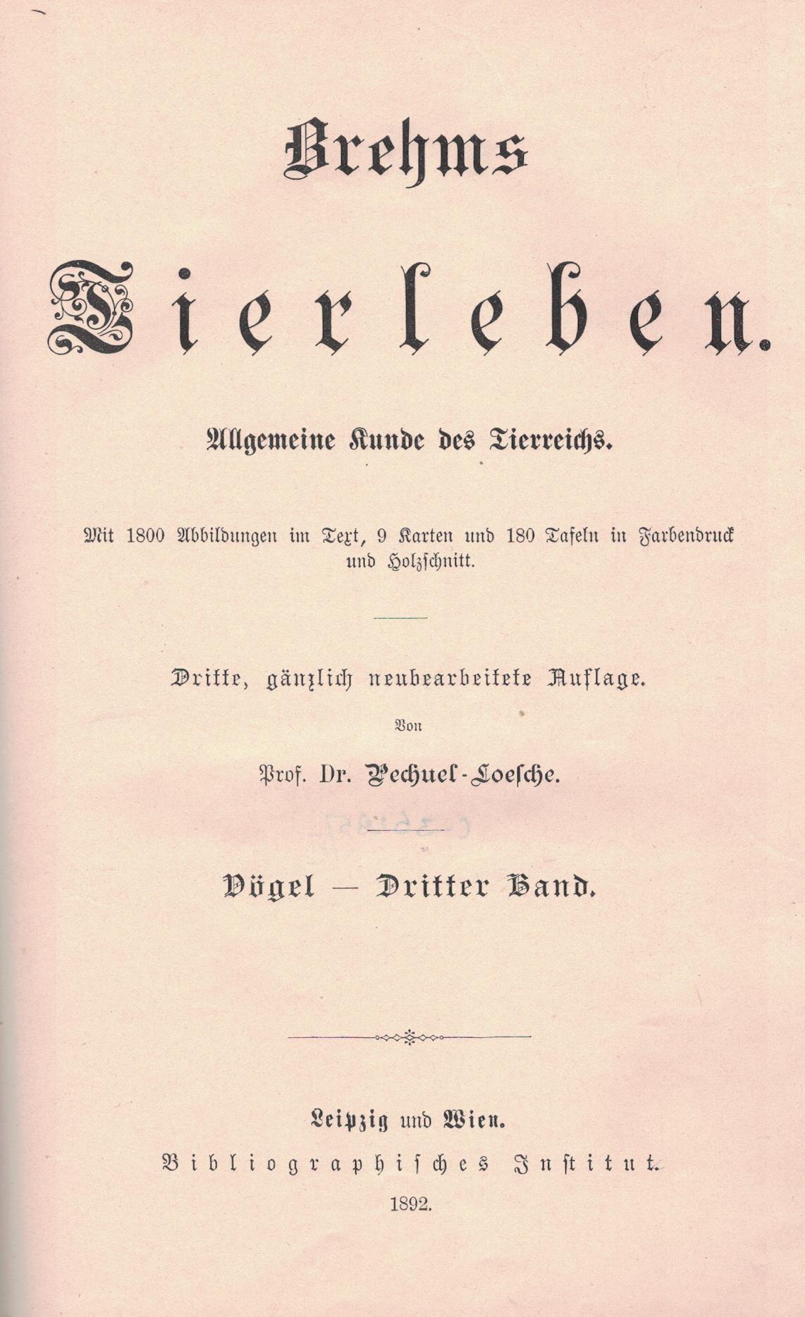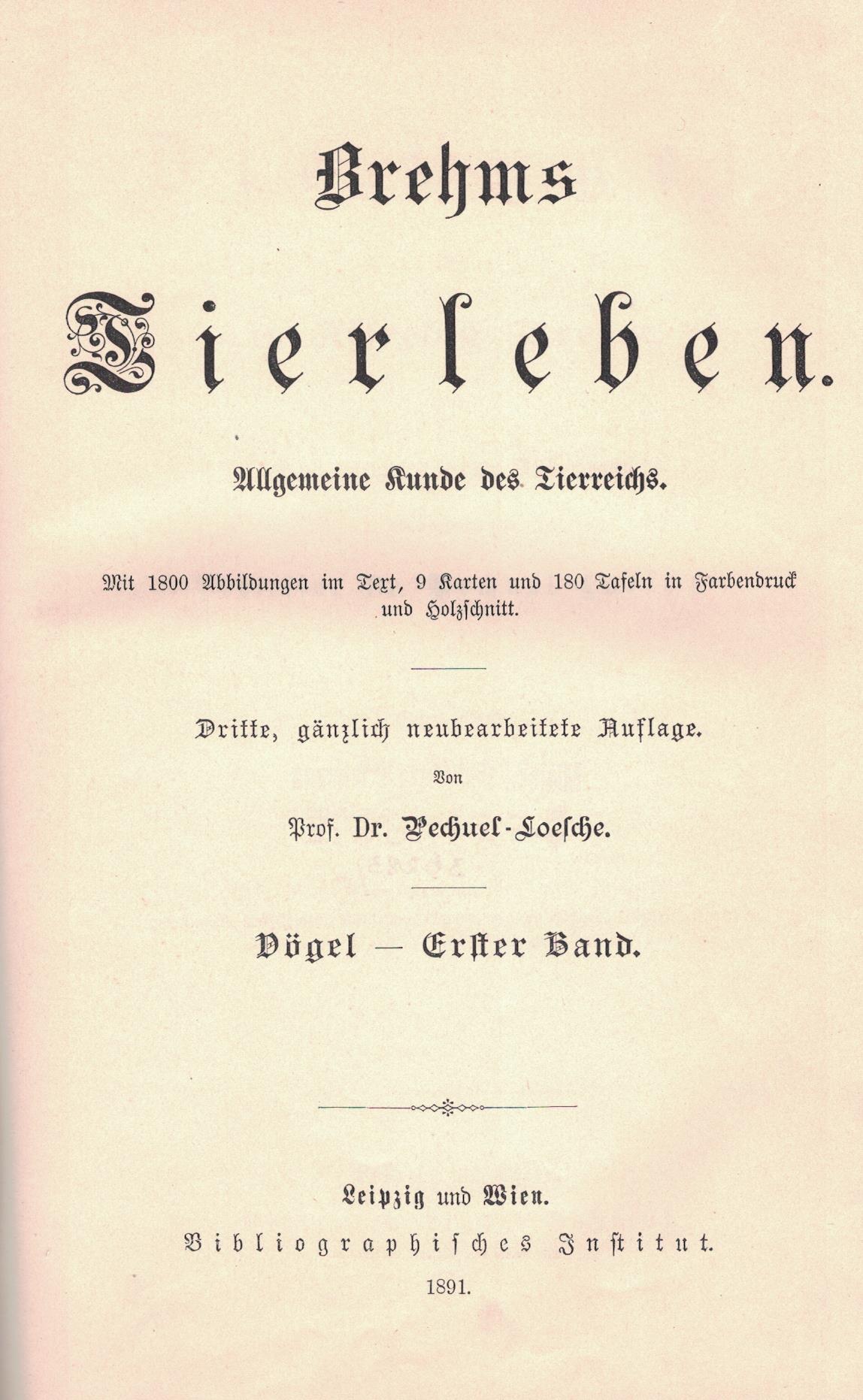 Brehms Tierleben : allgemeine Kunde des Tierreichs. Bd. 5, Die Vögel. Bd. 2. - 3, gänzlich neubearbeitete Auflage / von Pechuel-Loesche. - Leipzig ; Wien : Bibliographischen Institut, 1891. - XIV, 713, [5] stron, [18] kart tablic : ilustracje ; 26 cm.