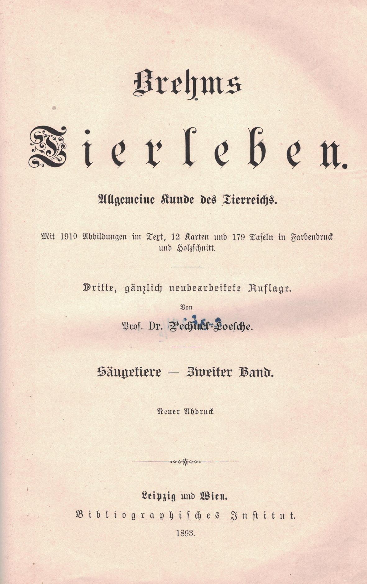 Brehms Tierleben : allgemeine Kunde des Tierreichs. Bd. 2, Die Säugetiere. - 3, gänzlich neubearbeitete Auflage / von Pechuel-Loesche. - Leipzig ; Wien : Bibliographischen Institut, 1893. - XII, 708, [4] strony, [25] kart tablic : ilustracje ; 26 cm.