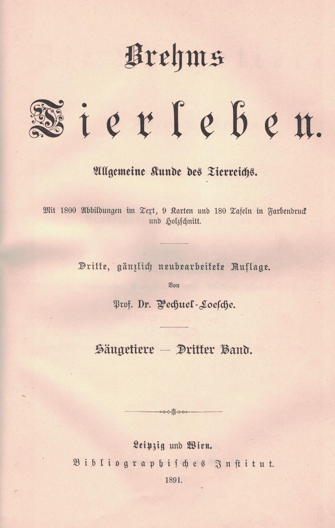 Brehms Tierleben : allgemeine Kunde des Tierreichs. Bd. 3, Die Säugetiere. - 3, gänzlich neubearbeitete Auflage / von Pechuel-Loesche. - Leipzig ; Wien : Bibliographischen Institut, 1891. - XII, 744, [12] stron, [19] kart tablic : ilustracje, mapy ; 26 cm.