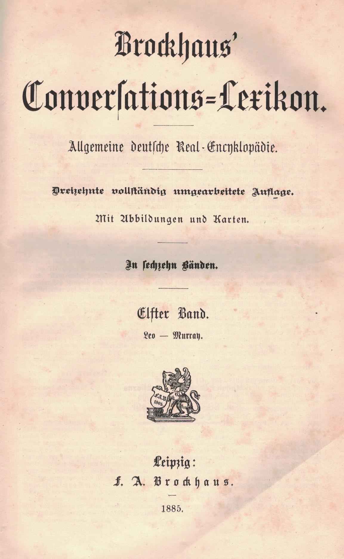 Brockhaus' Conversations - Lexikon : allgemeine deutsche Real-Encyklopädie. B. 11, Leo - Murrah. - 13, vollständig umgearbeitete Auflage. - Leipzig : Brockhaus, 1885. - [4], 954, [2] strony, [39] karty tablic (niektóre złożone) ; 26 cm.