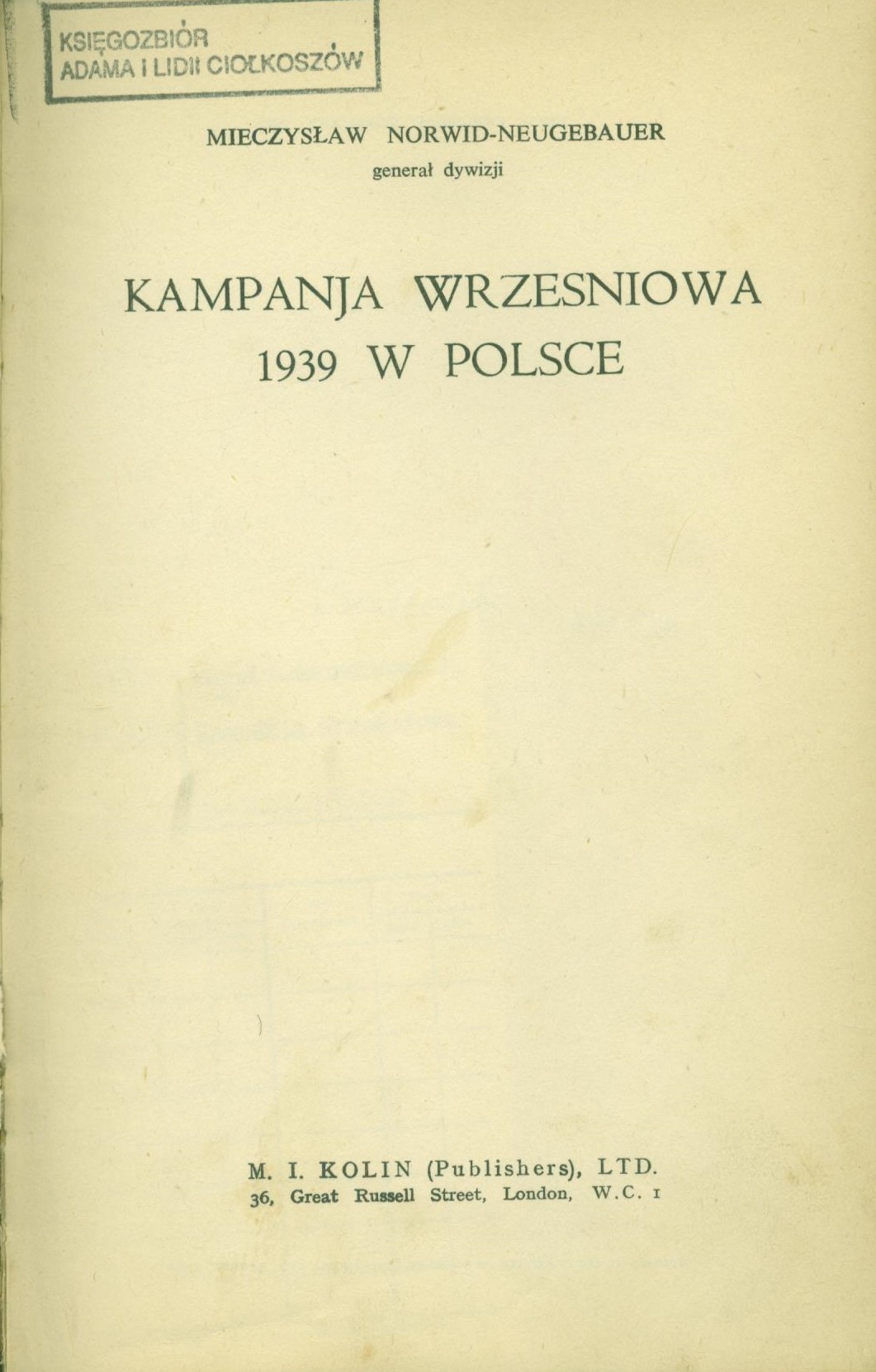 Kampanja wrześniowa 1939 w Polsce / Mieczysław Norwid-Neugebauer. - London : M. I. Kolin, 1941. - X, [2], 160, IV stron, 17 kart tablic : ilustracje, mapy ; 23 cm.