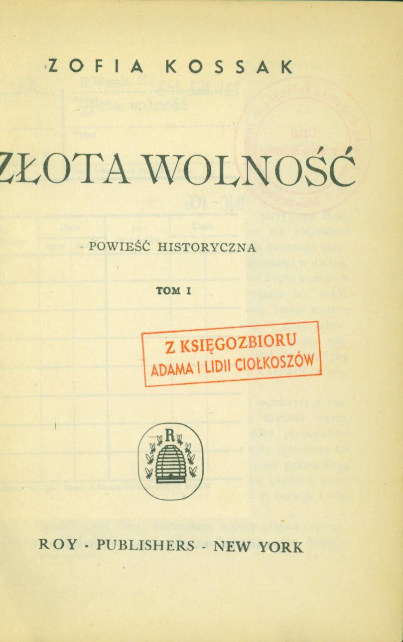 Złota wolność : powieść historyczna. T. 1-2 / Zofia Kossak. - New York : Roy Publishers, [1945?]. - t. 1 [2], 282, [2] strony ; t. 2 [2], 284, [1] strona ; 17 cm.